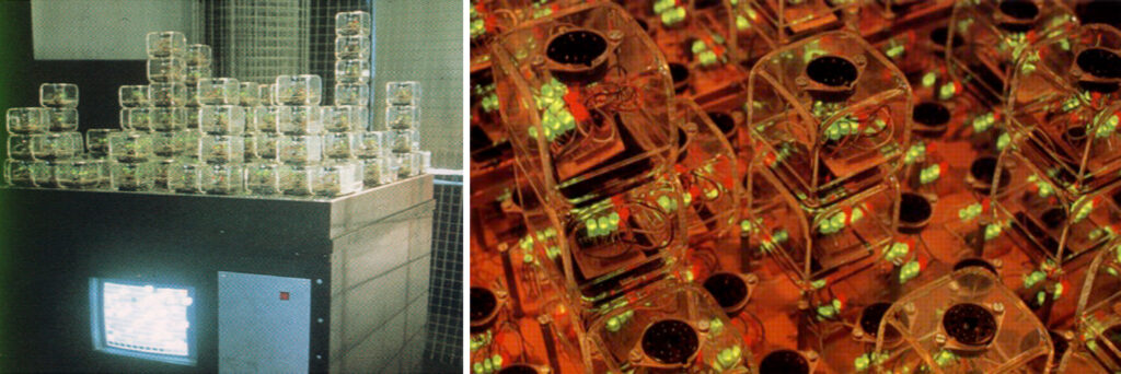圖01: John Frazer 1990任教於AA Diploma Unit 11 的學生作品: 藉由燈光傳遞訊息與使用者互動的裝置‘The Universal Constructor’(出處:John Frazer,  An Evolutionary Architecture)