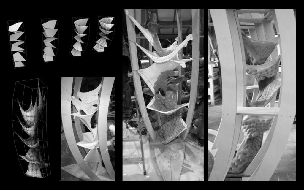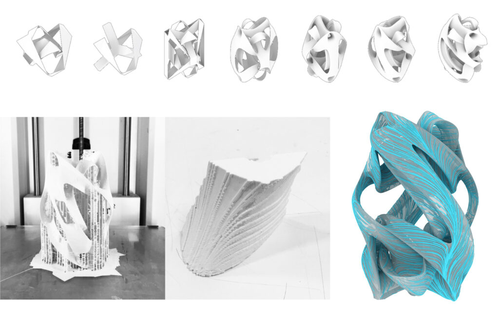 DRL的人機協作初體驗從Workshop工作坊開始,過程中學生能同時學習數位空間裡物件與變因等之間的互動,以及當設計主體在電腦螢幕之外,對材料本質與真實性的理解,如何回饋數位模型的設定。藉由4-6週裝置尺度的物件操作練習,學生體驗從「虛擬實境」到「實擬虛境」的方法流程,與它在設計研究與創作上所扮演的主動角色。例如,Soft Cast 工作坊(圖03-1)研究材料行為與型構,在縫有圖案的彈性布容器中澆灌流動的石膏,布的拉張力與石膏的重力在石膏凝固的瞬間達到平衡。以電腦模擬彈性布的圖案與其受重力影響的垂墜型態,同時實作澆灌模型測試,檢視結果與預期間的落差,了解如何控制多種變因,做設計的調整及演化。Infinity Loop 工作坊(圖03-2),研究以柏拉圖幾何體(Platonic Solid)為起點的拓樸形變發展,並於曲面模型的表面上以向量場(vector field)生成圖案紋理,並以3D Printer列印將虛擬資訊轉換成實體,透過來回操作學習控制複雜型態的生成與機械生產的流程。在Workshop的練習後,為期一年的畢業設計Studio,除了指導老師Studio Master在Design Brief給的一套中心思想,學生團隊得透過研究與實驗尋找設計議題與方向。