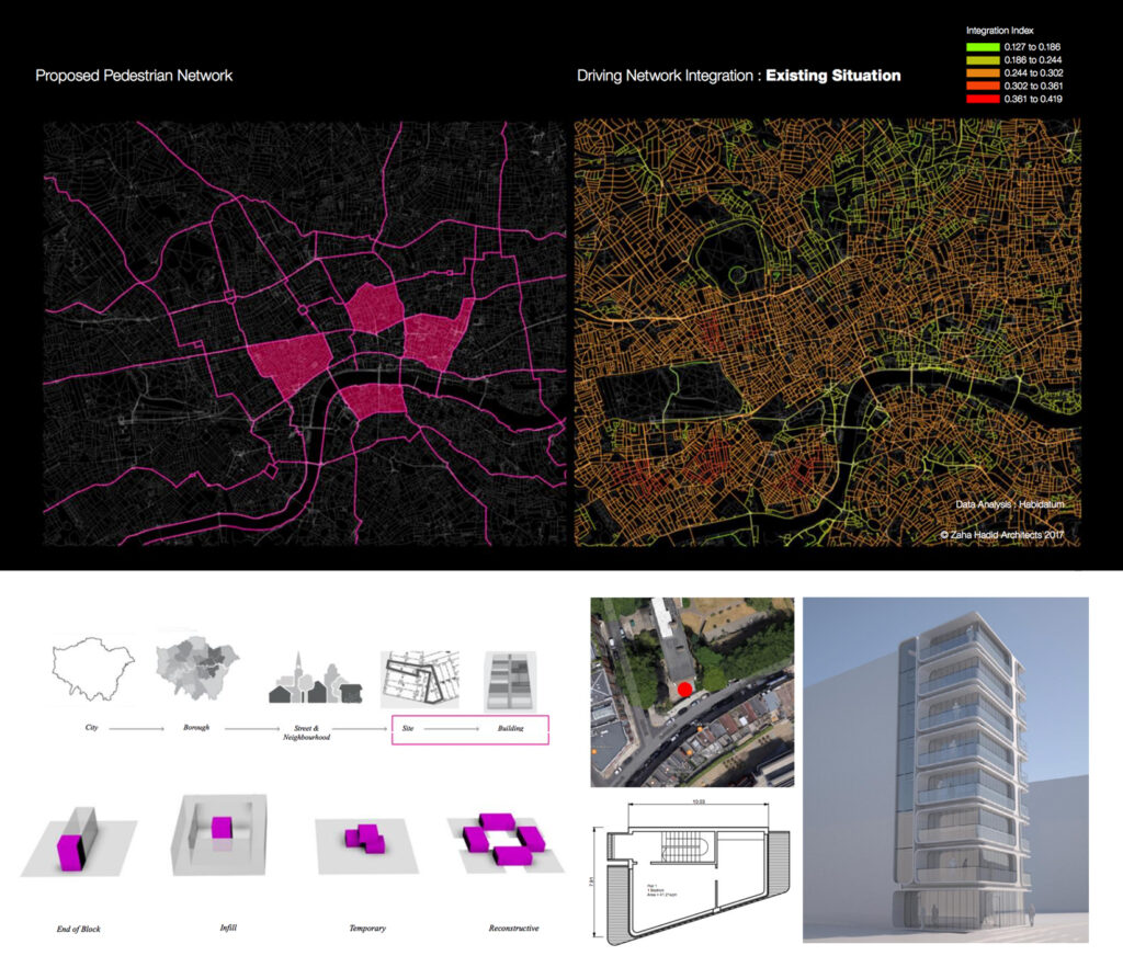 除了運用科技增進與業主的溝通,ZHA近來對參與公眾事務也不遺餘力,試圖與各界對話。例如CODE為倫敦市所做的願景規劃提案「步行倫敦」(Walkable London),運用大數據的分析與視覺化,來支持從人行街道到街廓三個階段的設計規劃(圖06-1)。規劃案在多種層次上觸及跨領域的人機協作:都市數據公司Habidatum、工程公司Buro Happold的Smart Team參與合作,與CODE一起建構倫敦城市的資料平台,彙整與都市的交通、車站節點、人行動線、建築物密度、防災動線等層面的資料。當資料庫建置到一定程度,便可在平台上編輯參數,模擬可能發生的情境,檢視當提案的街道與街廓完全被人行步道取代的時候,將會對車輛交通、行人步行通勤時間、空氣品質、周邊商業活動、房價、市民情緒指數等造成什麼影響。規劃案進一步對倫敦棘手的居住問題提出另類解決策略:設定一套運算規則在「步行倫敦」裡的住宅街廓指認尚可做增建開發的空地。8(圖06-2)